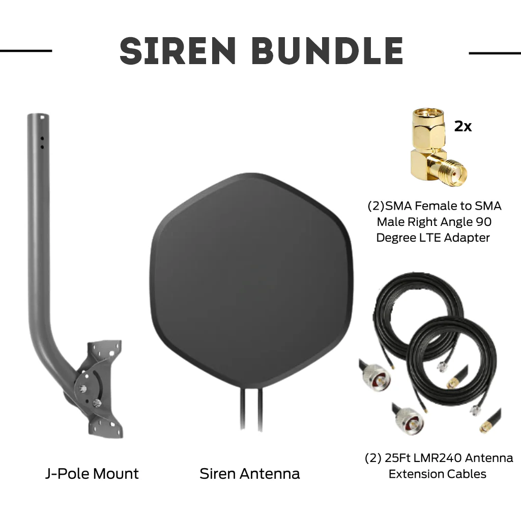 * Katalyst SIREN Antenna Bundle - Includes Katalyst SIREN Antenna, J-Mount Style Bracket with 22-inch Pipe Mast, 2x SMA Female to SMA Male Right Angle 90 Degree LTE Adapters, 2x 25ft LMR240 Low Loss Antenna Cable Extension